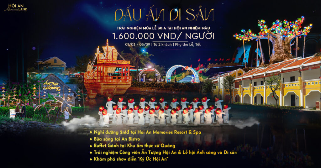 Especially on the occasion of the year-end, Hoi An Memories Resort & Spa is offering an attractive combo that includes both a vacation and a cultural experience. For only 1,500,000 VND/person, guests will enjoy a 2-day, 1-night stay at the resort, a breakfast buffet at An Bistro, a Ganh buffet at Lang Viet (Viet Village), an exploration of Hoi An Impression Theme Park, tickets to the Hoi An Memories show, and a boat ride to release flower lanterns on the Hoai River.