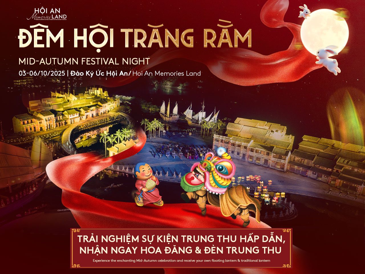 Bước vào Đảo Ký Ức Hội An trong dịp lễ hội, du khách sẽ choáng ngợp trước khung cảnh rực rỡ của những dãy đèn lồng cùng loạt tiểu cảnh Trung thu độc đáo. Trong không gian ấy, tiếng trống hội vang lên, hòa cùng sắc màu Trung thu truyền thống, khiến ai cũng như được trở về với những ký ức tuổi thơ. Đây là nơi lý tưởng để cả gia đình tận hưởng mùa trăng tròn trọn vẹn và đầy cảm xúc.